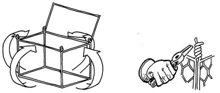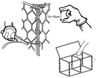 4、各個表面綁扎在一起。使用長度適宜的綁絲,首先綁扎在一頭,然后間隔10~15cm穿過網孔,進行單圈、雙圈的交替纏繞。為了保證網面間的緊密結合,纏繞時要用力,拉緊。 隔板絞合時注意沿一條豎直線絞合,而且絞合后的隔板是在同一豎直面上。