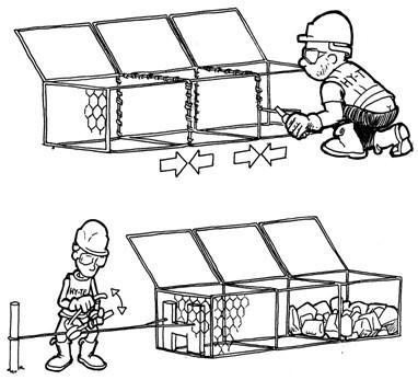1、取出一個完整的格賓單元,校正彎曲、變形的部分,可采用鉗子拉或用腳踩的方式整平,主要注意以下幾個方面: