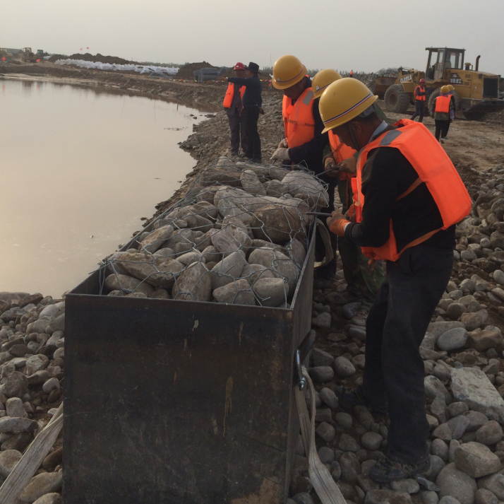 石籠網采用組裝方式,蓋板,邊板,端板,底板單獨生產組裝成網箱,各部分用螺旋鋼絲纏繞捆綁,網箱所有邊絲均采用粗絲加強石籠網的強度.