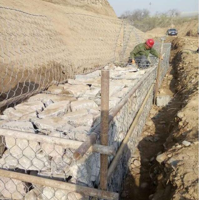 (6)耐久性:石籠網材料采用熱鍍10%鋁鋅工藝使表面鍍層厚而穩定,有效減少鋼絲氧化作用,據實驗室試驗,10%鋁鋅合金鋼絲在室外有效使用年限可達50-70年.