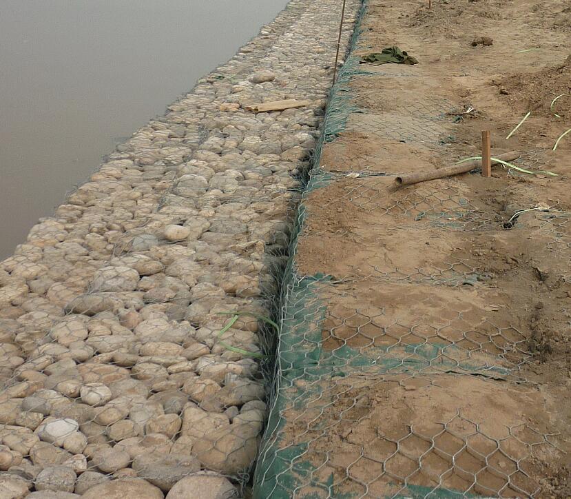 雷諾護(hù)墊也叫石籠護(hù)墊,格賓護(hù)墊,是指由機(jī)編雙絞合六邊形金屬網(wǎng)面構(gòu)成的厚度遠(yuǎn)小于長度和寬度的墊形工程構(gòu)件,雷諾護(hù)墊中裝入塊石等填充料后連接成一體,成為主要用于水利堤防、岸坡、海漫等的防沖刷結(jié)構(gòu),具有柔性、對地基適應(yīng)性的優(yōu)點(diǎn),